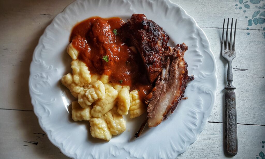 Za pripremu ovog jela koristila sam lonac od lijevanog željeza koji se može koristiti i na plinu i u pećnici skupa s poklopcem. Meso vepra sam marinirala mješavinom senfa, balzamičkog octa, papra, lovorovog lista i ružmarina. Za pripremu ovog jela koristila sam rebra s flamom i lopaticu. Navedeni sastojci su za dvije do tri osobe.