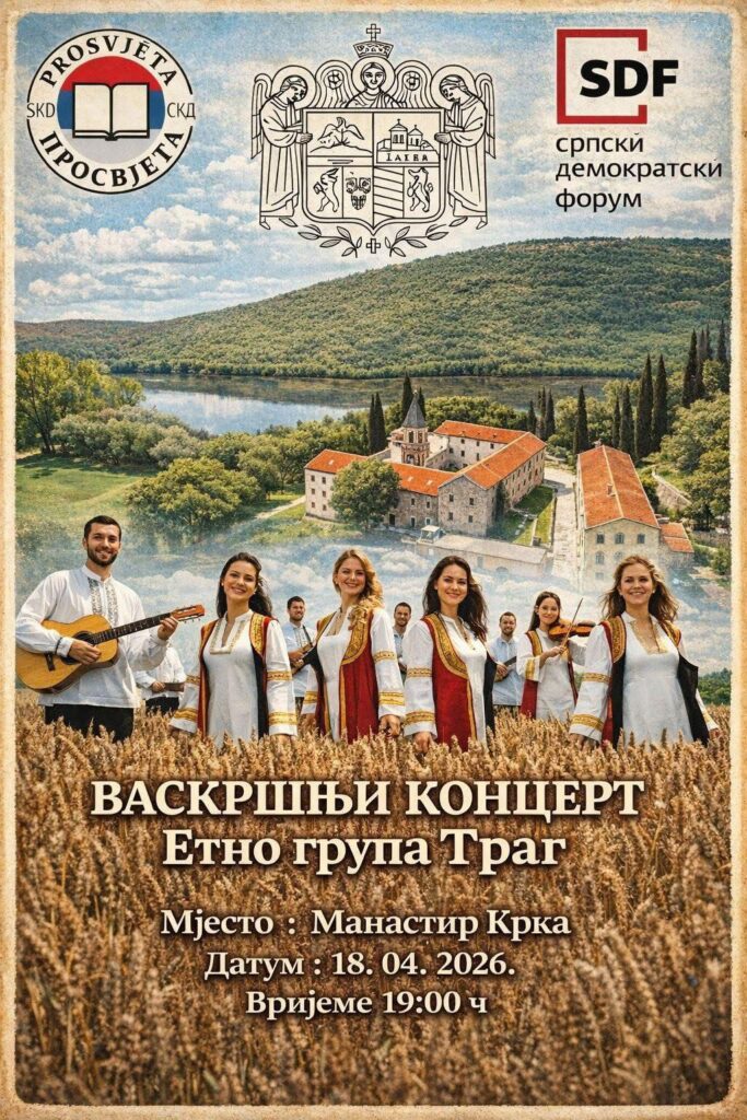 У сарадњи са СКД Просвјетom,  са радошћу најављујемо Васкршњи концерт Етно групе Траг, који ће се одржати у суботу, 18. априла, са почетком у 19 часова, у Манастиру Крка.